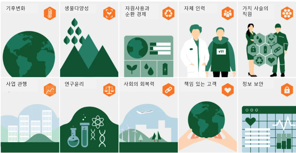 | 이중 중대성 분석(Double Materiality Analysis) 이 분석은 ‘영향의 중대성(Impact Materiality)’과 ‘재무적 중대성(Financial Materiality)’이라는 두 가지 관점에서 VTT의 지속가능성을 평가함. 즉, VTT의 활동이 사람과 환경에 미치는 긍정적 및 부정적 영향과, 지속가능성 관련 리스크 및 기회가 VTT의 재무 상태에 미치는 영향을 동시에 식별하고 평가 유럽 지속가능성 보고 표준(ESRS) 프레임워크에 따라 수행된 이번 분석은 내·외부 이해관계자들의 의견을 종합적으로 반영함. 분석 결과, VTT의 운영에 있어 다음과 같은 핵심 지속가능성 주제들이 중대하게 파악 – 환경 분야: 기후변화, 생물다양성, 순환경제 및 자원 활용 – 사회 분야: 자체 인력 및 가치사슬 내 노동자 복지 – 지배구조 분야: 사업 관행, 연구 윤리, 정보 보안, 책임 있는 고객 관계 – 사회적 영향: 사회의 회복탄력성(resilience) 예를 들어, 기후변화와 관련해서는 VTT의 연구·혁신 활동이 기후변화 완화 및 적응에 기여하는 긍정적 영향과 동시에, 자체 운영 및 가치사슬에서 발생하는 온실가스 배출이라는 부정적 영향이 확인됨. 이와 함께 개발 기술의 상업화를 통한 재정적 기회와 기후변화로 인한 물리적 운영 방해 리스크도 함께 분석 |